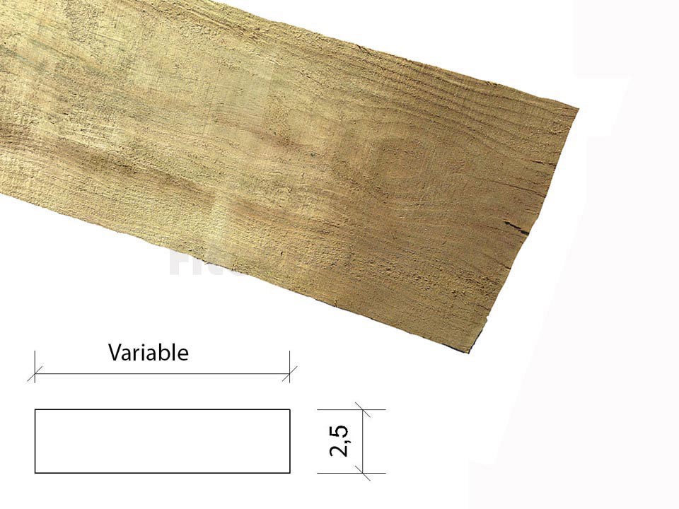 Taula de pi Nacional tractada per a exterior amb protecció IV sense respallar. De 2,5cm de gruix i ample variable de 2,5 m de llarg. Recomanades per a fusta d'exterior, en tancaments i parets de fusta rústica.